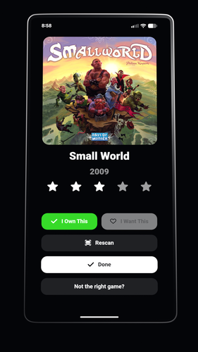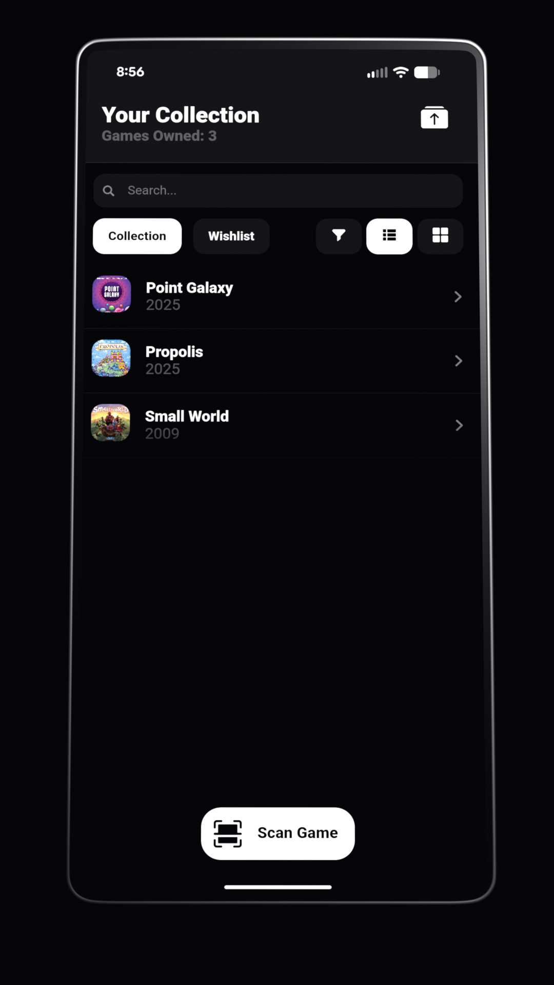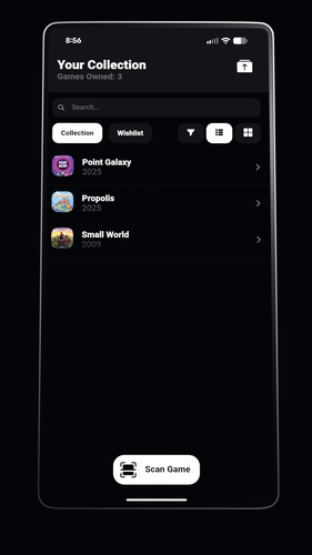 Board Game Scanner lets you easily scan in your board games via their barcode . You can add games to your collection or wishlist them. You can give your games a personal rating and filter by them. You can also export your data if you'd like to use a different software to view your data.